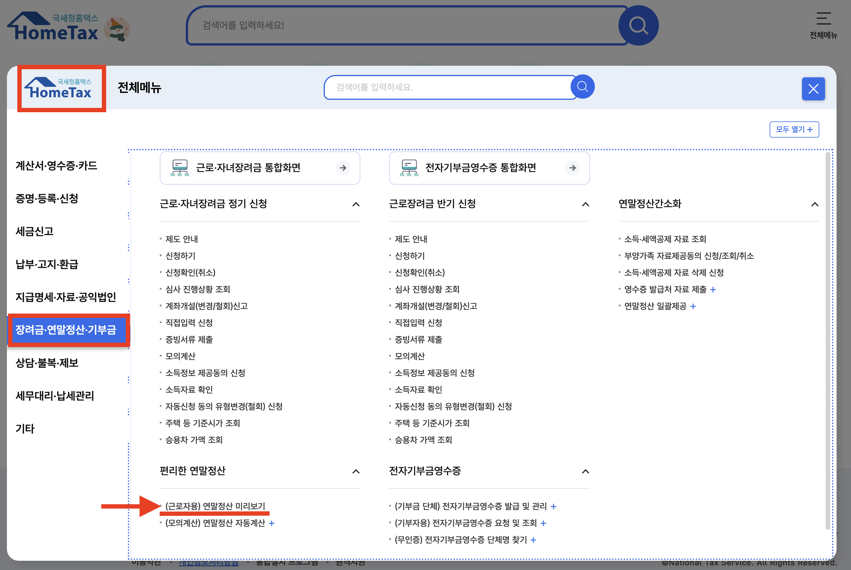 * 상단 메뉴에서 ‘장려금·연말정산·기부금’ 선택