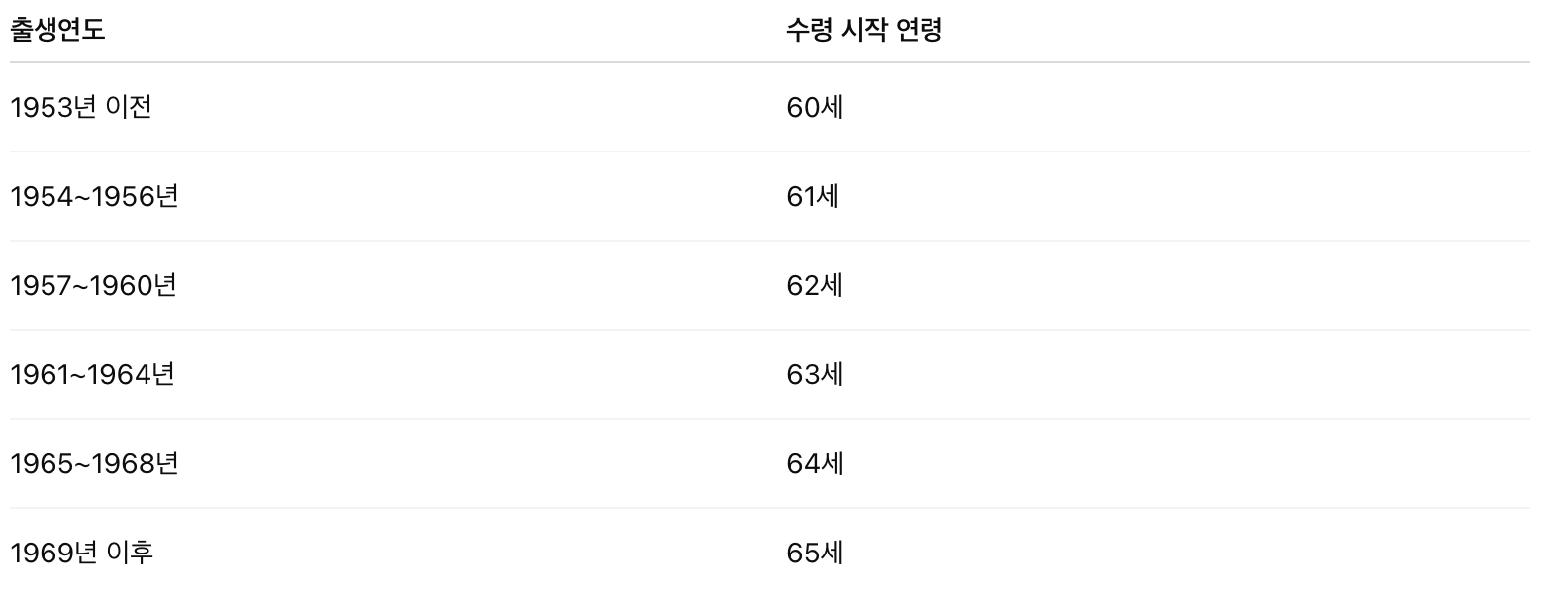 출생 연도에 따라 60~65세부터 수령 가능합니다. 1969년 이후 출생자는 만 65세부터 수령합니다.