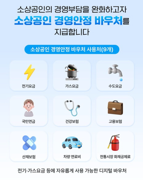 이번 바우처는 단순 현금성 지원이 아니라, 전기·가스요금, 4대 세금, 연료비 등 실제 사업 운영에 반드시 필요한 항목에 사용할 수 있는 디지털 바우처로 제공되어 체감 효과가 큰 것이 특징입니다.