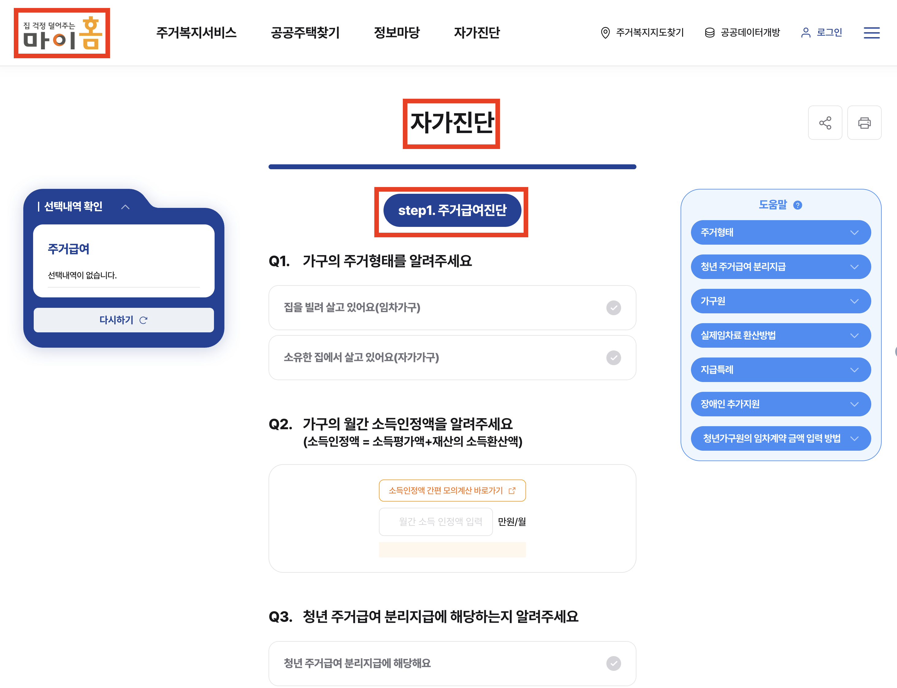 마이홈포털에서 내가 주거급여를 받을수 있는지 자가진단 서비스를 제공하고 있습니다.